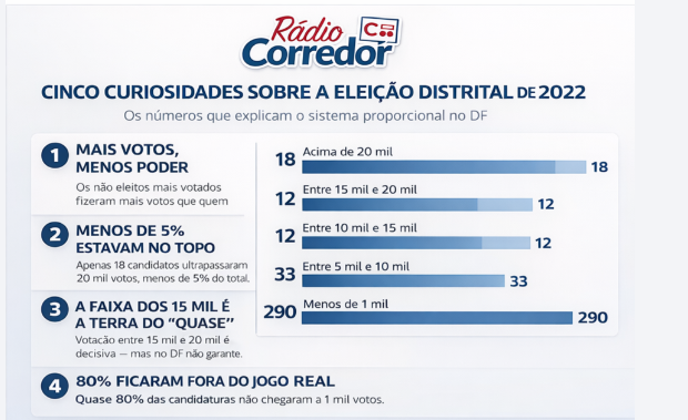 Na prática, isso significa que o processo eleitoral distrital no DF tem um topo muito disputado e uma base enorme que, muitas vezes, existe para completar chapa e ajudar o partido a somar votos — ainda que esse candidato individualmente não tenha chance de cadeira.