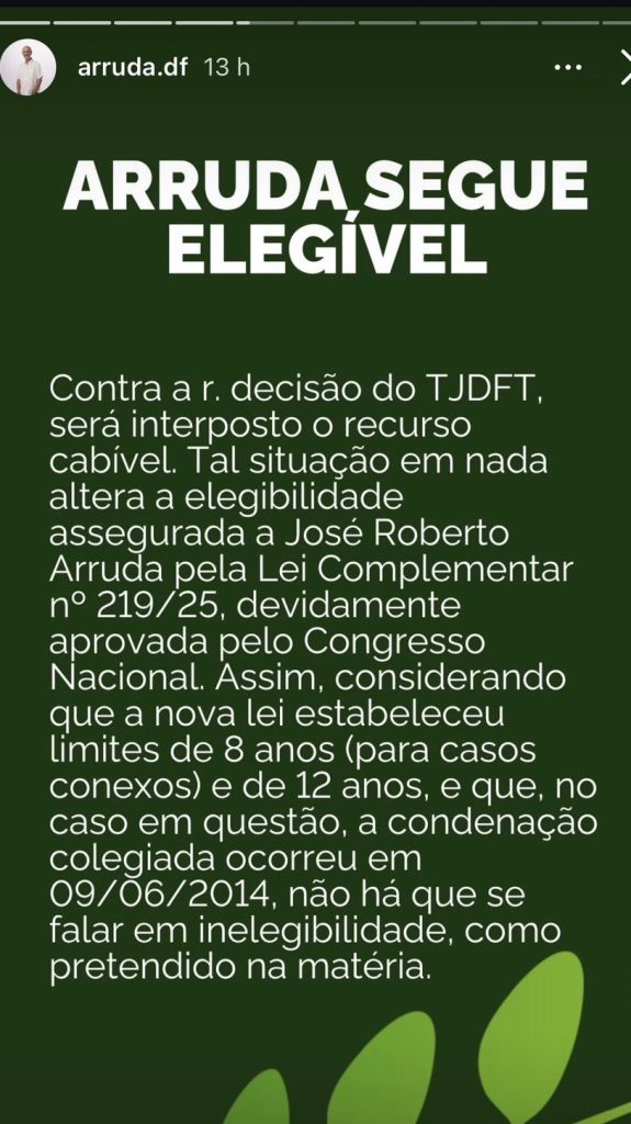 Números nas pesquisas até importam – Arruda aparece forte em segundo lugar em algumas sondagens –, mas ele pode escorrer pelas mãos rapidinho com essa instabilidade jurídica. Advogados divergem feio: uns defendem que a Lei Complementar 219/2025 (a “nova Ficha Limpa”, sancionada em setembro/2025) o salva, fixando prazo máximo de 12 anos a partir da primeira condenação colegiada (julho/2014), o que expiraria em julho/2026 – a tempo das eleições de outubro. Pela interpretação literal, ele estaria elegível hoje.