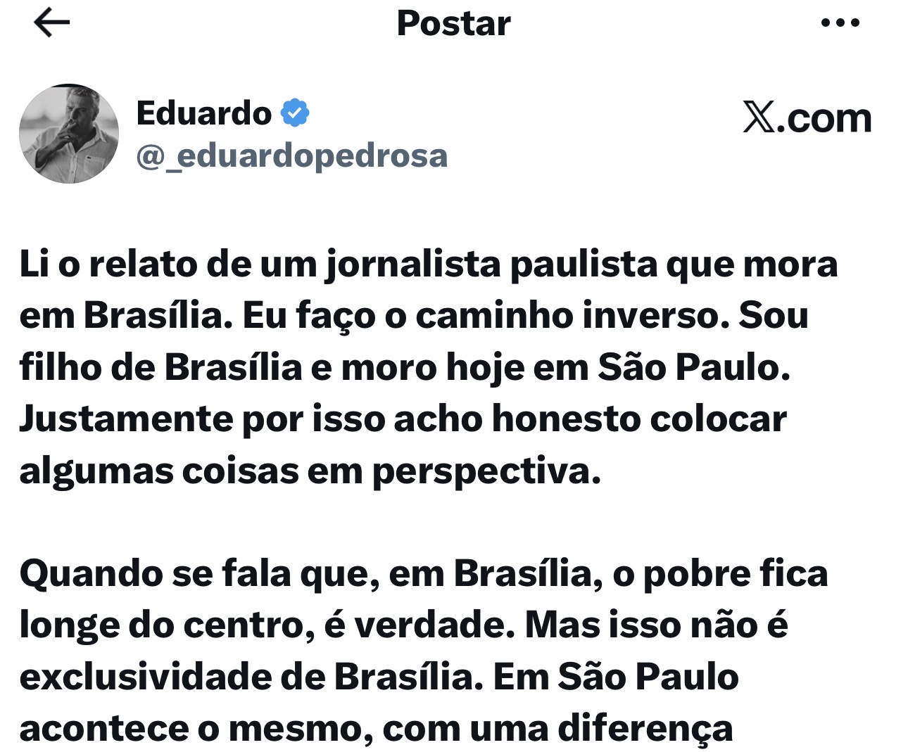 Eduardo Pedrosa iniciou sua resposta reconhecendo que há verdades no relato de Pancher, mas alertou para o risco da generalização. “Sou filho de Brasília e moro hoje em São Paulo. Justamente por isso acho honesto colocar algumas coisas em perspectiva”, escreveu.